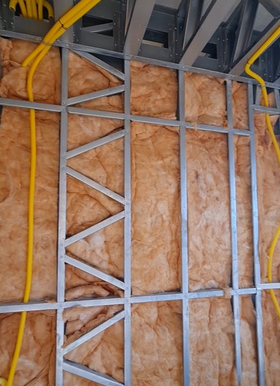 • Isolamento: Mantas ou placas de materiais isolantes (lã de vidro, lã de rocha, PET, EPS) são inseridas nos vãos da estrutura (paredes, forro, piso) para garantir o conforto térmico e acústico.
