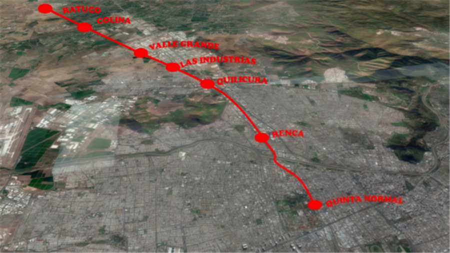 Um mapa mostrando o projeto do trem Santiago-Batuco, com 24 km de extensão, em Santiago, Chile.