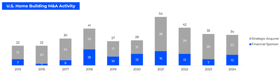 Os últimos anos têm se mostrado especialmente favoráveis para quem deseja vender uma empresa no setor de construção residencial dos Estados Unidos. Apesar da leve queda no número de transações desde o pico de 54 negócios em 2021 — impulsionado pela reabertura econômica pós-pandemia — o ano de 2024 registrou 34 transações, número ligeiramente acima da média da última década.